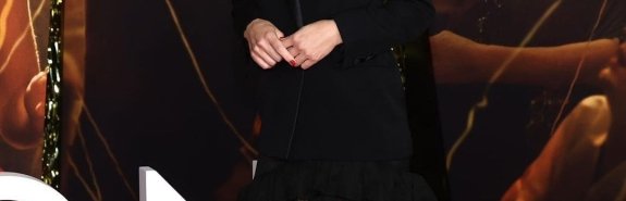 Для светского мероприятия звезда надела красивые вечерний ансамбль от бренда Saint Laurent. На ней был черный жакет с атласными лацканами и цветком, а также платье с полупрозрачной юбкой с оборками.