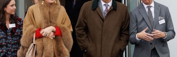 На улице королева набросила поверх костюма пальто с мехом под цвет ее обуви. Также Матильда не забыла надеть свое любимое кольцо с сапфиром, часы и золотой браслет на запястье.