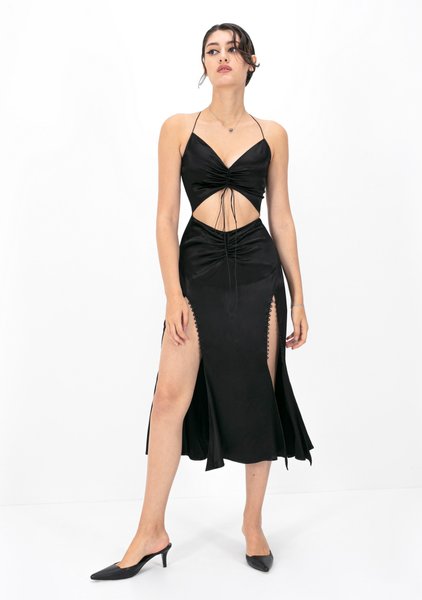 На Минди было пурпурное платье длины миди Andromeda приталенного силуэта с завязками и вырезами из коллекции Phenomenon.