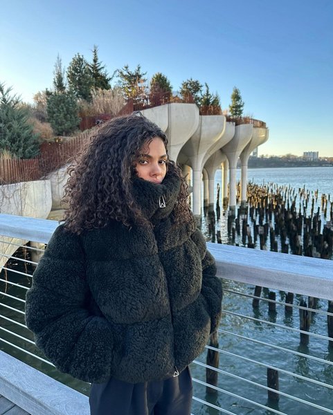 На фото молодая жена Венсана Касселя позирует в укороченном плюшевом пуховике коричневого оттенка с высокой горловиной и свободных темных брюках. Черные вьющиеся волосы Кунаки традиционно были распущены.
