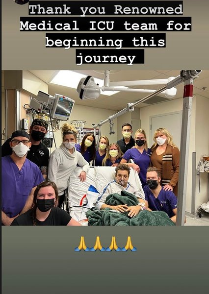 "Спасибо известной команде врачей интенсивной терапии за то, что начали это путешествие", — подписал актер снимок, на котором он лежит на больничной койке в окружении медсестер и врачей.
