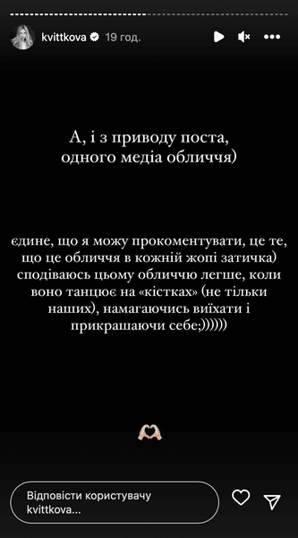 "Надеюсь, этому лицу легче, когда оно танцует на "костях" (не только наших), пытаясь выехать и украшая себя", — отметила Даша Квиткова, намекая, судя по всему, на новый пост телеведущего Григория Решетника.