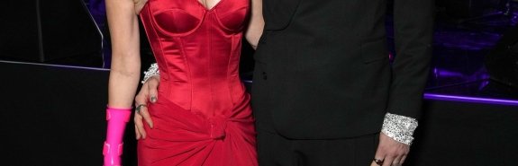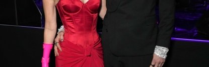 Накануне звездная пара посетила ежегодную вечеринку Клайва Дэвиса, а Меган Фокс попала в заголовки газет благодаря сочетанию ярко-розового браслета с красным платьем без бретелей.