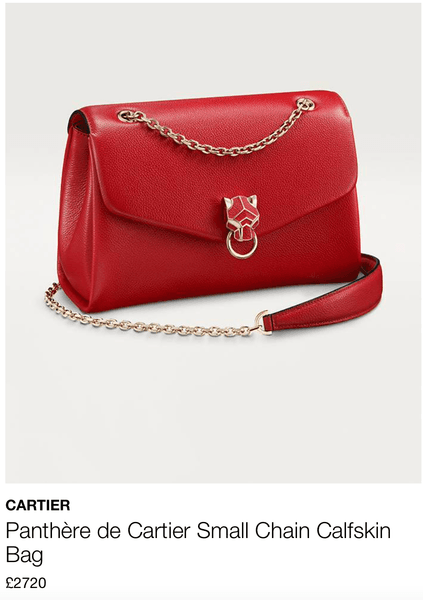 Его последнее дополнение, сумка Panthère de Cartier, имеет классическую надпись. От золотого ремешка на цепочке и изысканной застежки до ряда цветов – на выбор черный, синий, белый, серый или красный – эта дизайнерская сумка имеет эффект вневременности.