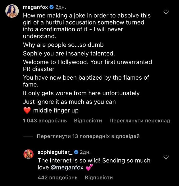 36-летняя американская актриса Меган Фокс публично восхваляет гитаристку Софи Ллойд после того, как опровергла слухи об измене Machine Gun Kelly.