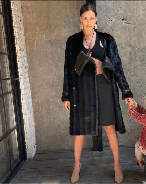 Дочь российской модели и американского актера держала модель за руку, но Шейк уверенно смотрела в объектив камеры. Звезда подиумов позировала в черной юбке, топе и укороченном пальто. Волосы модели были собраны в аккуратный пучок, а к образу она добавила несколько золотистых украшений.