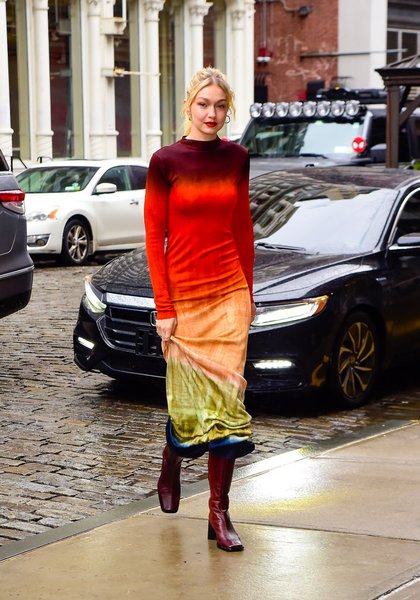 Свой образ Джиджи дополнила парой шоколадно-коричневых сапог с квадратным носком. Красная помада сделала ее макияж ярким на фоне не менее яркого платья. Золотые сережки украшали ее уши.