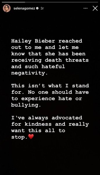 "Хейли Бибер связалась со мной и сообщила, что она получала угрозы убийством и такой ненавистный негатив", — написала Гомес в Instagram Story.