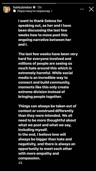 "Мы все должны быть более внимательны к тому, что мы публикуем и что мы говорим, включая меня", – подытожила Бибер. "В конце концов, я считаю, что любви всегда будет больше, чем ненависти и негатива, и всегда есть возможность встретить друг друга с большей эмпатией и состраданием".