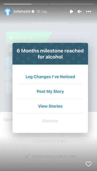 26-летняя американская модель Белла Хадид призналась фанатам, что уже шесть месяцев не употребляет алкоголь. Звезда подиумов палестинского происхождения опубликовала в своем Instagram скриншот из приложения, которое считает количество "трезвых" дней.