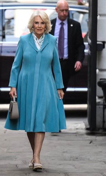 75-летняя Камилла была в бирюзовом платье-пальто и белом шелковом шарфе, дополнив образ темно-коричневой сумкой с верхней ручкой ($452) от Charlotte Elizabeth, британского бренда, который когда-то носила Меган Маркл.
