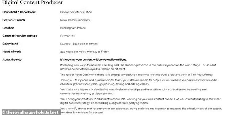 "Это знание, что ваш контент просмотрят миллионы. Это поиск новых способов сохранить присутствие короля и королевы в глазах общественности и на мировой арене. Присоединившись к нашей стремительной и динамичной цифровой команде, вы будете предоставлять цифровую продукцию через наш веб-сайт, электронные коммуникации и каналы социальных сетей, в основном путем планирования, съемки и монтажа видео. Вы примете ключевую роль в развитии значимых отношений и взаимодействии с нашей аудиторией, создавая и заказывая разнообразное видеосодержимое", – говорится в описании вакансии.
