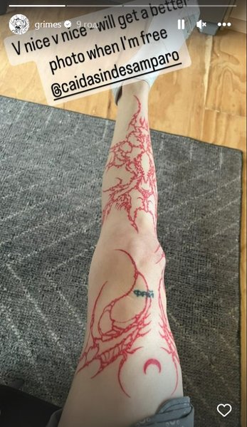 35-летняя канадская певица Граймс, бывшая девушка Илона Маска и мать его двоих детей, продолжает свои эксперименты с татуировками. В сторис Instagram девушка опубликовала несколько снимков новой тату.