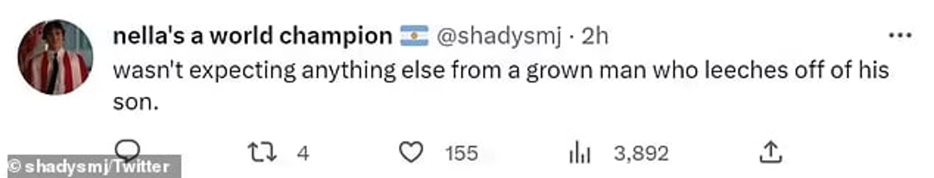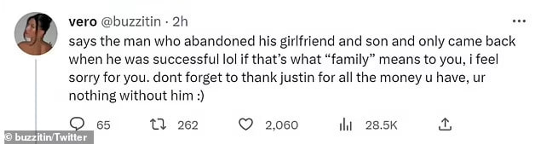 "Да! спасибо натуральному мужчине, который оставил свою женщину на время воспитания ребенка в одиночестве. Вы определенно лучший человек для чего-то о семье, уважении и любви", "Говорит мужчина, который бросил своего ребенка и вернулся только потому, что тот стал знаменитым… вот как вы уважаете семью?", "Не забудьте поблагодарить Джастина за все деньги, которые у вас есть", "Говорит парень, который бросил своего сына и вернулся к жизни только после того, как стал миллионером", "Честно говоря, я думаю, что человек, который бросил своего сына и вернулся к своей жизни только после того, как стал миллионером, намного хуже" "Ты такой жалкий", "Не забудьте поблагодарить своего сына, которого вы бросили в младенчестве, за деньги, которые у вас есть сейчас", "Смеюсь. Зачем кому-то слушать вас на тему семей??", "Извините, да, давайте прославим семьи". Три "семьи", которые вы создали, состоят из трех разных женщин, у которых есть дети", – пишут под публикациями.