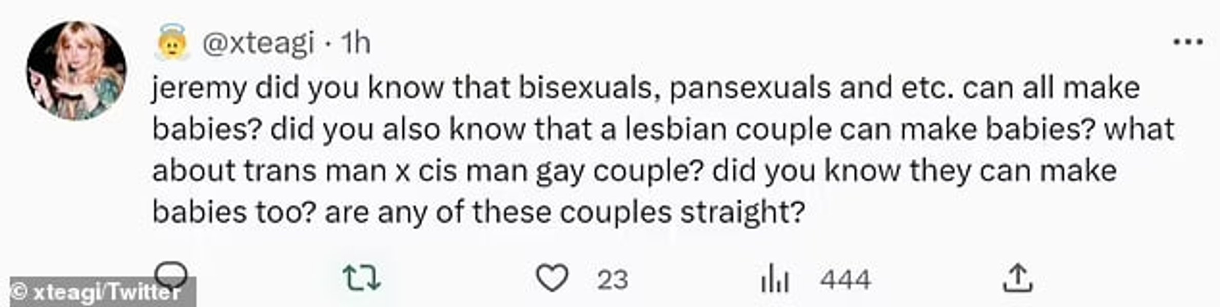 Под шквалом критики Джереми удалил сообщение с радужным флагом, но все равно остался при своем мнении.