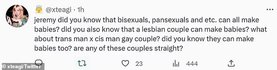 Мужчина запостил радужный флаг и добавил "Не забудьте поблагодарить натурала в этом месяце за ваше существование". Перед этим он написал еще одно сообщение: "Нам нужно прославлять семьи. Ты знаешь, почему мы все здесь! То, что прославляет это поколение, невероятно!"