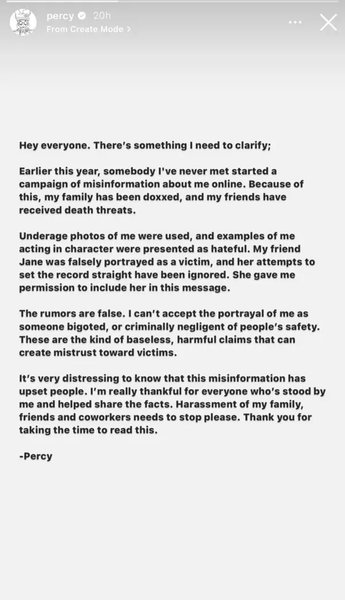 В сторис Instagram Перси написал, что ему "нужно кое-что прояснить".
