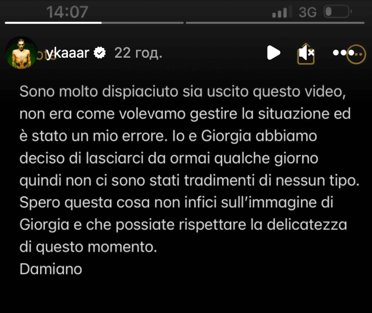 Дамьяно обратился к своим фанатам, чтобы попросить прощения, а также сообщить, что он и его девушка Джорджия Солери разошлись.