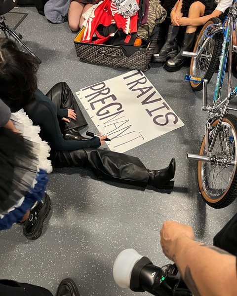 На видео Кортни, одетая во все черное, прыгала в толпе фанатов на стадионе BMO в Лос-Анджелесе, держа в руках плакат с большими черными буквами, на котором было написано: "Трэвис, я беременна!"