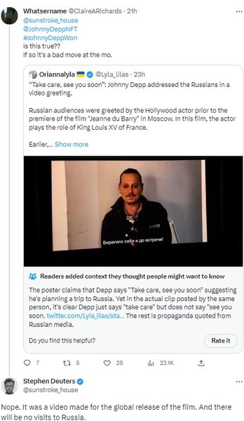 Видеообращение, в котором 60-летний голливудский актер Джонни Депп говорит о том, что приедет в Россию со своим фильмом "Жанна Дюбарри" и желает россиянам "беречь себя", произвело эффект разорвавшейся бомбы на поклонников знаменитости. Многие фанаты искренне были разочарованы такой позицией суперзвезды. Однако, как оказалось, все совсем не так, как это представила российская пропаганда и подхватили многие отечественные СМИ. На самом деле Депп адресовал свои слова не россиянам. Его обращение записали в связи с мировой премьерой исторической картины. Об этом на своей странице в Twitter сообщил американский кинопродюсер и ассистент актера Стивен Дойтерс.