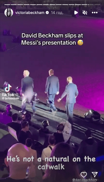 49-летняя британская певица и дизайнер Виктория Бекхэм потроллила в Instagram своего мужа Дэвида после того, как он едва не поскользнулся на презентации Лионеля Месси, который присоединился к его команде Интер Майами MLS.
