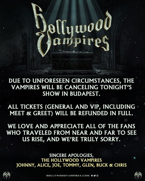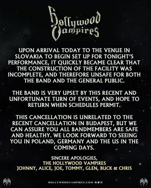 "Мы с нетерпением ждем встречи с вами в Польше, Германии и США в ближайшие дни. Приносим искренние извинения, The Hollywood Vampires", — говорится в обращении к поклонникам и любителям концертов.