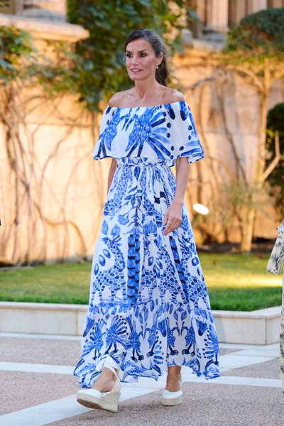 Монаршая персона надела белое сдержанное платье с синим принтом и открытыми плечами. Бывшая журналистка собрала волосы в хвост, когда она прибыла во дворец Маривент в Пальме. На ногах Летиции были белые босоножки на платформе.