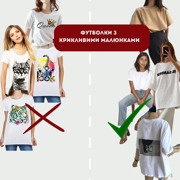 Футболки с большими яркими рисунками, вроде котиков, львов, корон и прочей "красоты" немедленно спрячьте подальше.