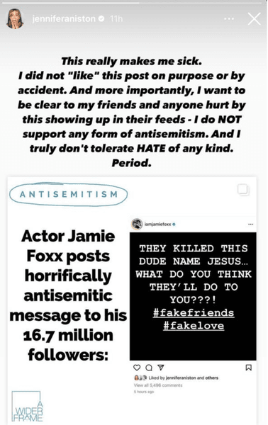 54-летняя американская актриса Дженнифер Энистон ответила на обвинения в антисемитизме. Своей позицией звезда сериала "Друзья" поделилась в Instagram.