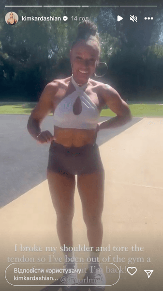 Кардашьян не появилась на видео, которое опубликовала, но она продемонстрировала своего тренера Мелиссу Алькантару. Ким отметила, что у Алькантары однажды случилось то же самое с ее плечом, и что они готовятся начать процедуру восстановления.