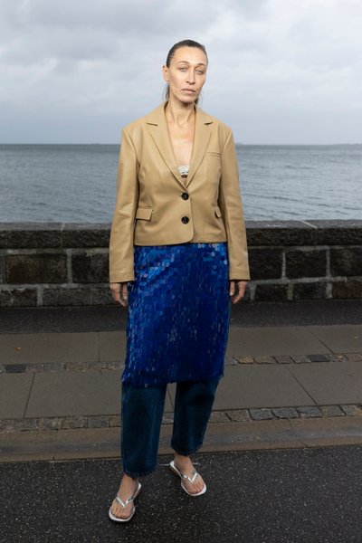 Стилист и соучредитель модного бренда La Detresse, которая недавно устроила вечеринку в древнегреческом стиле по случаю 40-летия с 28-летней Джиджи и Мариэль, представила бежевую кожаную куртку с крошечным белым бюстгальтером, расшитым бисером, причудливой синей юбкой с блестками, синими брюками под ней и парой серебристо-металлических шлепанцев.