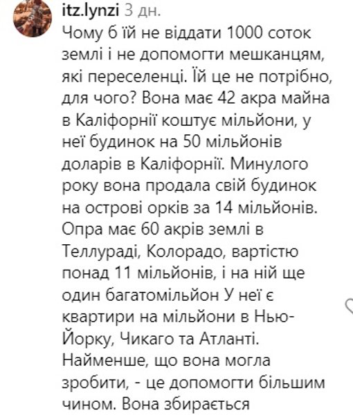 "Опра использует людей. Ей нужен только пиар", "Эмоциональная поддержка? Им нужна земля, им нужны деньги, чтобы восстановиться, им нужно много вещей, которые она может дать, кроме эмоциональной поддержки. Пускай те, кто не может помочь финансово, позаботится о молитвах, но подождите, даже те, кто не может помочь финансово, уже помогает больше, чем она. Она просто хочет большое шоу, чтобы прорекламировать себя", "К черту фото Опры. Спросите ее, почему она и ее приспешники из элиты не открыли свои поместья. Кроме того, забавно, что она там, но военные туда не пускают", "Почему бы ей не отдать 1000 акров земли и не помочь переселенцам. Ей это не нужно, для чего же? У нее есть недвижимость площадью 42 акра в Калифорнии стоимостью в миллионы долларов, у нее есть дом в Калифорнии за 50 миллионов долларов. В прошлом году она продала свой дом на острове Оркас за 14 миллионов. У Опры есть 60 акров земли в Теллуриде, штат Колорадо, стоимостью более 11 миллионов долларов, на которой стоит еще один многомиллионный дом. У нее есть многомиллионные квартиры в Нью-Йорке, Чикаго и Атланте. Меньшее, что она могла сделать, это помочь по-крупному. Собирается ли она использовать свой частный самолет стоимостью 25 миллионов долларов для отправки припасов? Нет, просто купите горсть подушек нескольким пожилым людям в приюте и подложите их перед камерой. Она стоит МИЛЛИАРДЫ, и эти люди потеряли все, некоторые даже жизнь", "Ни одного человека или семьи не забрали в ее поместье с помощью. Но, наверное, она пригласила всех выдающихся политиков на обед/ужин в течение этого времени", – раздраженно пишут пользователи.
