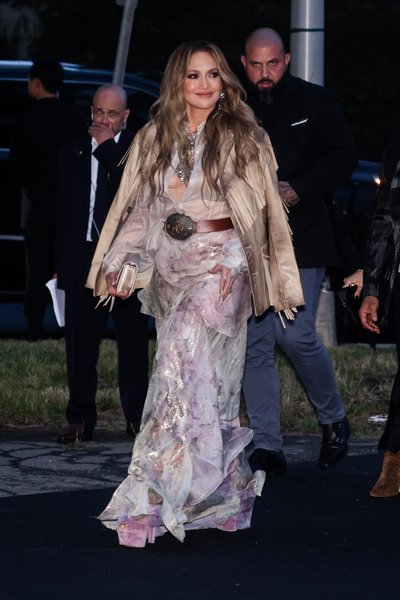 Джей Ло привлекла внимание публики, надев многослойное шелковое полупрозрачное платье с металлическими деталями. Верхняя часть ансамбля была лишь частично застегнута, демонстрируя массивное серебряное ожерелье, которое покрывало большую часть ее груди.