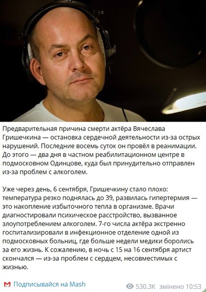 Telegram-канал "НеМалахов" утверждает, что Вячеслав Гришечкин умирал в муках.
