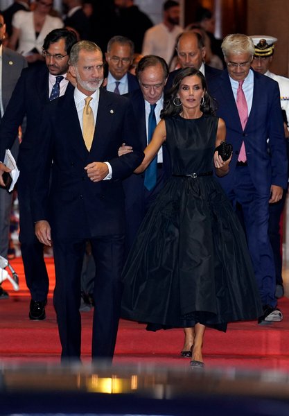 Жена короля Филиппа продемонстрировала черное платье в стиле старого Голливуда с юбкой А-силуэта и зажатой талией от испанского бренда THE 2ND SKIN CO.