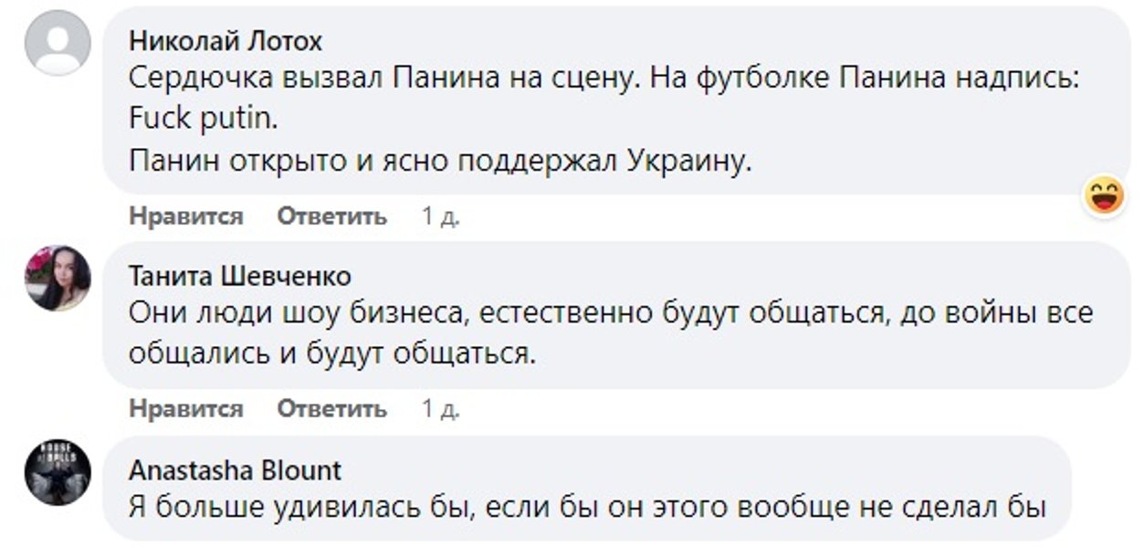 "Ну, Белоцерковская объявлена иноагентом в рашке, давно уже гражданка Франции и очень мощно помогает нашему волонтерскому фонду "Светлый" (Светлана Легенькая). Она находит и доставляет нереальные вещи для наших военных девочек на фронт. Сердючка мне была, есть и будет пофиг", "Белоцерковская помогает ВСУ, Солнцев капец как кроет рашку, это все в открытом доступе… Наш Андрей Данилко круть и респект!", "Следует следить за подаемой информацией, Белоцерковская очень масштабно поддерживает и помогает Украине", "Сердючка вызвал Панина на сцену. На футболке Панина надпись: Fuck putin. Панин открыто и ясно поддержал Украину", "С*ердючка не исключение из этой попсовой тусовки. Коньюктурщиков и приспособленцев там большинство, вспомните хотя бы недавний зашквар такого же пошиба со Скрипкой… Они вынуждены приспосабливаться, но на самом деле их все время тянет к родной, понятной и комфортной для них среде", – пишут пользователи.