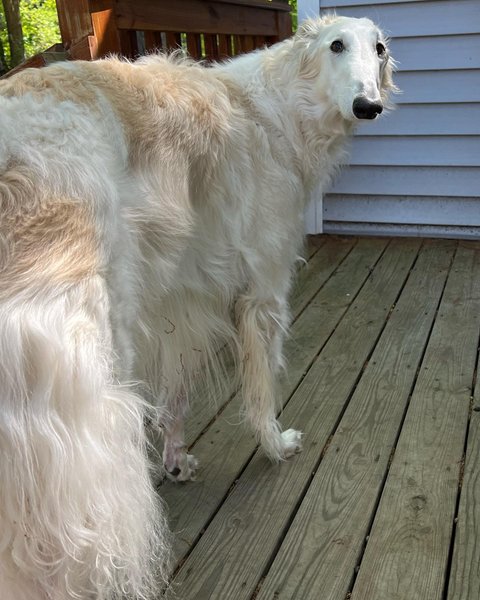 Длинный нос дает этой борзой существенное преимущество: она сует его в очень маленькие щели между диванами, заборами или людьми, наслаждающимися едой за столом.