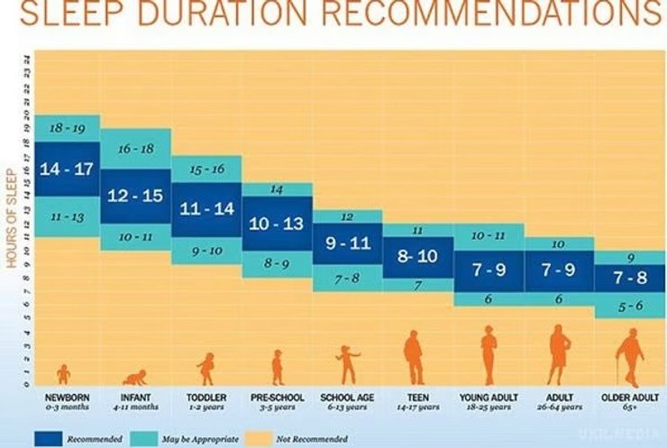 "Национальный фонд сна (NSF) отмечает, что не только качество сна, но и количество часов сна важно для хорошего самочувствия человека. На этой картинке вы видите сколько времени должны люди проводить во сне в разные периоды жизни", — отмечает Ксения Марченко.