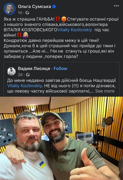 "Какой же страшный позор! Стягивать последние деньги с воина Национальной гвардии, известного певца, волонтера Виталия Козловского во время войны!" — написала 57-летняя артистка.