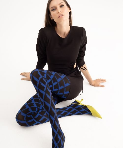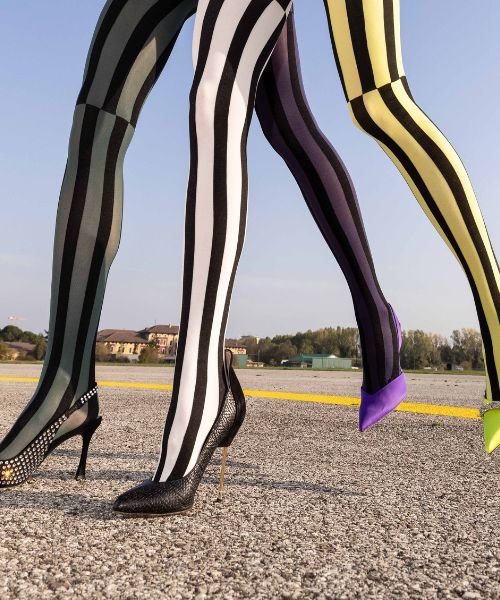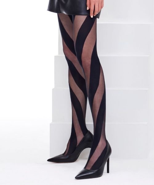В этом сезоне на пике – черные колготки с белой надписью от талии до пятки, а также колготы с большими контрастными полосками, создающими эффект прозрачных и непрозрачных колготок. Удлиненные полосы и неподвластный времени дизайн делают их идеальными для любого случая, независимо от того, повседневный это образ, вечерний ансамбль или элемент total look.