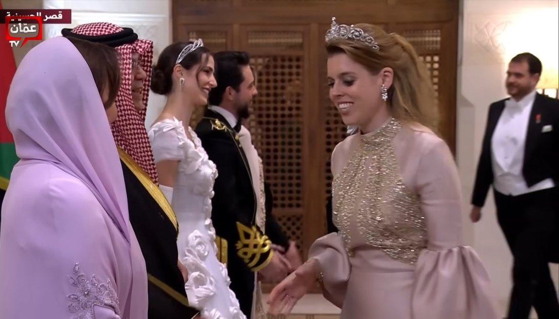На государственный банкет после свадьбы наследного принца Хусейна и Раджвы Аль Саиф в Иордании принцесса Беатрис надела атласное платье с украшенным лифом от Reem Acra и клатч Tyler Ellis. Она добавила образу особенный штрих, дополнив его йоркской тиарой, той же самой, которую ее мать, Сара Фергюсон, носила в день своей свадьбы в 1986 году.