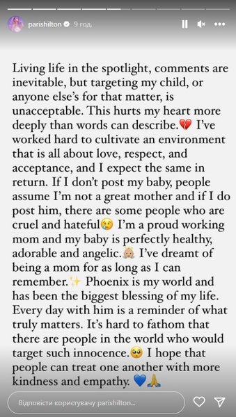 "Я всю жизнь нахожусь в центре внимания, комментарии обо мне неизбежны, но писать их в сторону моего сына или кого-то из моих близких — неприемлемо. Это ранит сердце сильнее, чем что-либо. Если я не буду публиковать фото ребенка, все решат, что я плохая мать. Но когда я делаю это, то встречаю жестоких и злых людей в комментариях. Я – любящая мать, а мой сын – ангел, и он абсолютно здоров. Мне трудно осознать, что на свете есть такие люди, чьей целью насмешек могут стать невинные дети. Я надеюсь, что мы сможем относиться друг к другу с большей добротой и сочувствием!" – заявила блондинка.