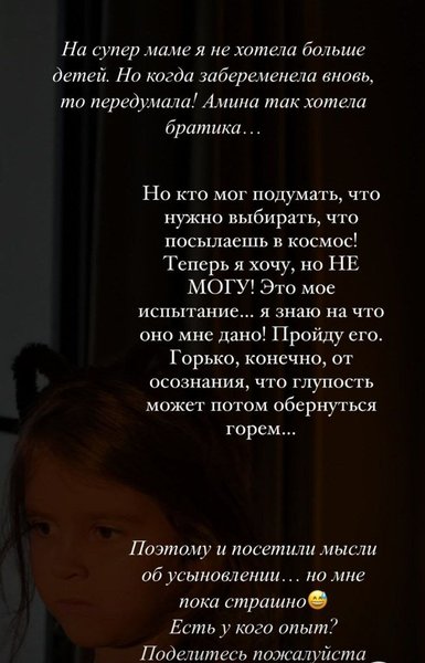 "На "Супермаме" я не хотела больше детей. Но когда снова забеременела, то передумала! Амина так хотела братика. Но кто мог подумать, что нужно выбирать, что посылаешь в космос! Теперь я хочу, но не могу. Это мое испытание, я знаю, на что оно мне дано. Я пройду его. Поэтому и возникли мысли об усыновлении, но мне пока страшно. Есть у кого-то опыт? Поделитесь, пожалуйста", – написала она.
