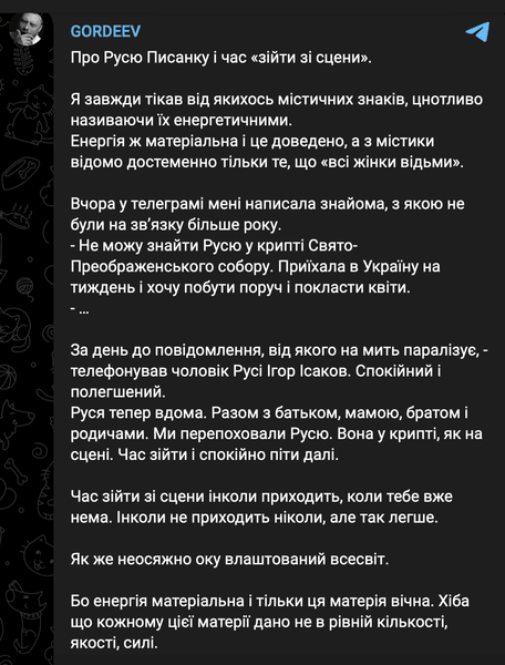 Важно"Звонил муж Руси Игорь Исаков. Спокойный и облегченный. Руся теперь дома. Вместе с отцом, мамой, братом и родственниками. Мы перезахоронили Русю. Она в крипте, как на сцене. Пора сойти и спокойно пойти дальше", — рассказывает Гордеев.