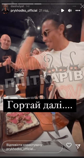 "Можно его в один котел к Фарион. Давайте и в дальнейшем ему верьте, когда он начинает петь в Украине украинские песни, потому что здесь ему вломят по самое не хочу, а когда не в Украине, то можно под свечечку похлопать в ладошки с Россией", — написала Приходько и опубликовала само видео вечеринки, на котором можно увидеть Потапа и услышать, как он говорит: "Глаз алмаз".