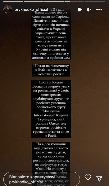 Украинская певица Анастасия Приходько раскритиковала Потапа за его вечеринку с россиянами в Дубае. Своими мыслями артистка поделилась в Instagram.