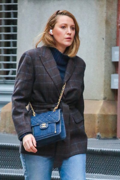 ВажноЖена Райана Рейнольдса, 47, дополнила осенний аутфит синей сумочкой Chanel через плечо. Ее светлые пряди спадали каскадом на плечи и контрастировали с темным тоном пиджака.