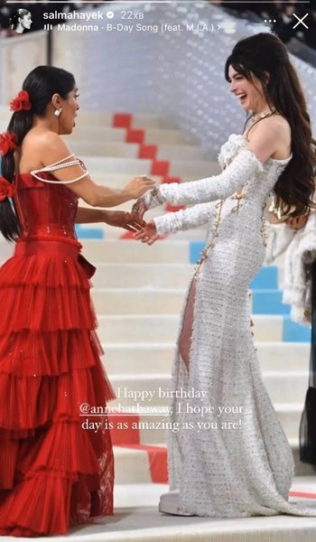 57-летняя мексикано-американская актриса Сальма Хайек поздравила с днем рождения свою коллегу по цеху Энн Хэтэуэй. Кадрами с именинницей звезда экрана делится в своем Instagram.