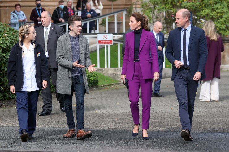 В ноябре прошлого года принц и принцесса Уэльские отправились в Бостон, штат Массачусетс (США), на церемонию вручения премии Earthshot Prize 2022. По трапу самолета Кейт спустилась в фиолетовом идеально скроенном брючном костюме от Alexander McQueen, под который надела черную водолазку. Образ завершал тонкий черный пояс.