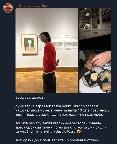 "Очень хорошая сейчас выставка работ Пикассо в национальном музее. у меня заняла 40 мин в медленном темпе. поэтому отмазки, что нет времени — не работают", — написала мама двоих детей.